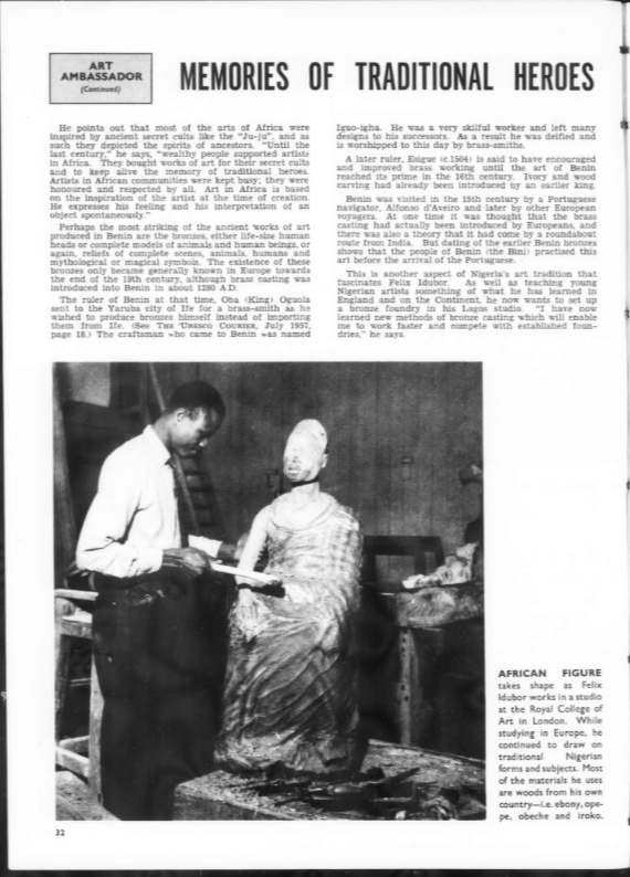 EARLY last year, a young Nigerian sculptor named Felix Idubor, dressed in his colourful native clothes, arrived in London to begin a special course of study at the Royal College of Art. A well-known artist in his own country, Idubor was making his first trip outside of Africa as the result of an international fellowship grant accorded to him by UNESCO (1).
