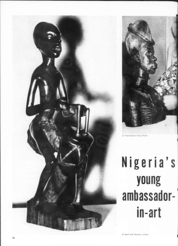 EBONY DRUMMER (opposite page) is a carving by Felix Idubor a young Nigerian sculptor whose work has won high praise from European art critics. A leading artist in his own country, he came to Europe last year on a UNESCO fellowship and studied in London where he held a one-man exhibition at the Imperial Institute. Examples of his work are shown here. As a result of his voyage, Idubor has learned new methods of bronze casting and expects to open a foundry in his African studio.